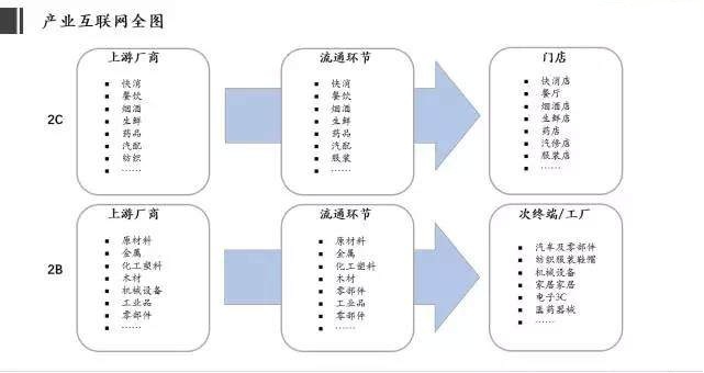 縱向看,不同垂直行業包括,快消、藥品、服裝、工業品、家裝、汽配等等。橫向看,大致分為幾個環節,原材料采集/生產 – 流通 – 產品生產– 流通 – 零售。