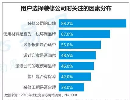 這樣的改變并非孤例,今年的《中國互聯網家裝行業年度分析報告》顯示,這一屆家裝用戶中,接近90%在選擇一家裝修公司時,最看重他們在互聯網平臺上積累的口碑。“口碑”已經超越了過去用戶最為關注的“品牌”,成為了年輕一代用戶決策的關鍵點,“互聯網+”對家裝行業,產生了深切的變革。