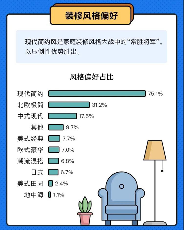 業內專家指出,有這么多業主選擇簡約風,跟整個行業的設計趨勢有很大關系。近年來,家裝設計師更傾向于做去風格化、去標簽化的設計,希望回歸體驗空間和材料的本質,棄繁從簡不容易過時。如果后期厭倦了簡約的居住風格,業主還可以通過一些簡單但精致的軟裝元素,比如:窗簾、壁紙、床、沙發等,局部改變空間風格,解決個性化需求,感受不一樣的生活體驗。這也反映了現代年輕人一種更灑脫的生活價值觀。
