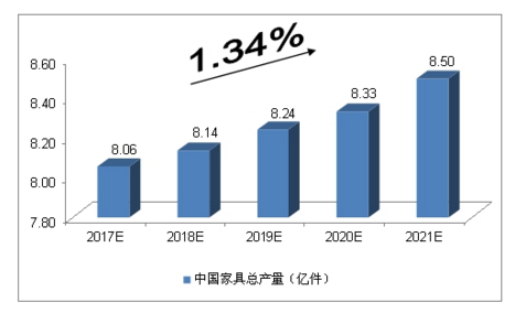 2014年,中國家具總產量為7.78億件,同比增長3.10%;2015年1-10月,中國家具總產量達到6.25億件,同比增長0.97%。綜合以上因素,我們預計,2017年中國家具總產量將達到8.06億件,未來五年(2017-2021)年均復合增長率約為1.34%,2021年中國家具總產量將達到8.50億件。