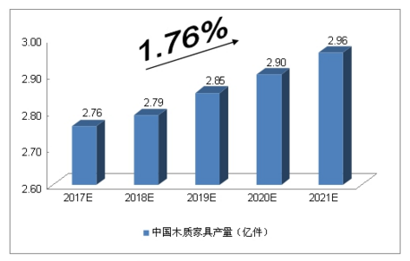 2014年,中國木質家具產量為2.63億件,同比增長1.59%;2015年1-10月,中國木質家具產量達到2.04億件,同比增長1.86%。綜合以上因素,我們預計,2017年中國木質家具產量將達到2.76億件,未來五年(2017-2021)年均復合增長率約為1.76%,2021年中國木質家具產量將達到2.96億件。